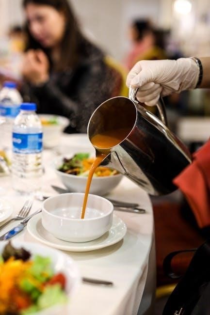 Begin with appetizers‚ served promptly after order confirmation‚ utilizing proper plate presentation techniques․ Follow with salads‚ ensuring dressings are offered separately․ Entrees should be served hot‚ maintaining food quality and visual appeal․ Coordinate with the kitchen for seamless timing between courses․