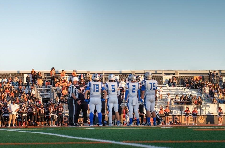 Football referee signals PDF resources include the NCAA Football Rulebook and the NFL Rulebook, offering detailed explanations and visual aids for officials.