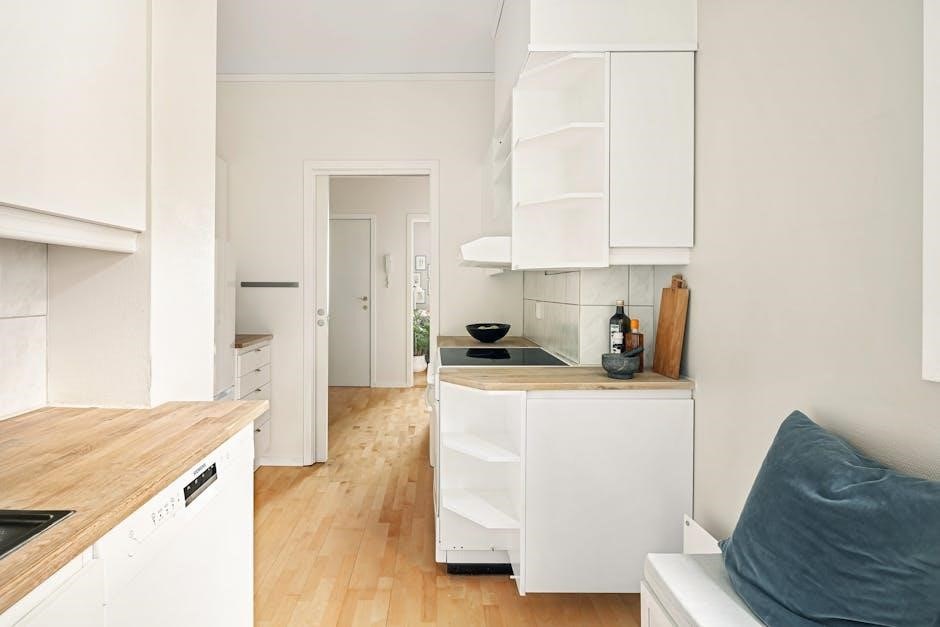 Single-wall kitchens, often depicted in kitchen PDFs, are ideal for apartments or smaller homes․ These layouts feature all appliances and cabinetry aligned along a single wall, maximizing floor space․ PDF plans for this style emphasize efficient use of vertical space with tall cabinets․