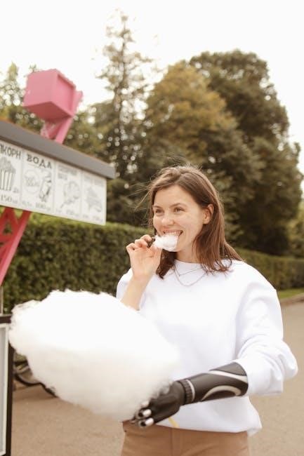 Q: How much sugar should I use? Start with a tablespoon, adjusting for desired floss volume․ Q: Why isn’t cotton candy forming? Ensure the machine is fully warmed and sugar is evenly distributed․ Q: Can I use any sugar? Granulated sugar works best; avoid powdered or coarse varieties․ Q: How long does it take to warm up? Typically 2-3 minutes, indicated by a ready light․ Q: Is it safe to operate continuously? Avoid prolonged use to prevent overheating; follow recommended duty cycles․